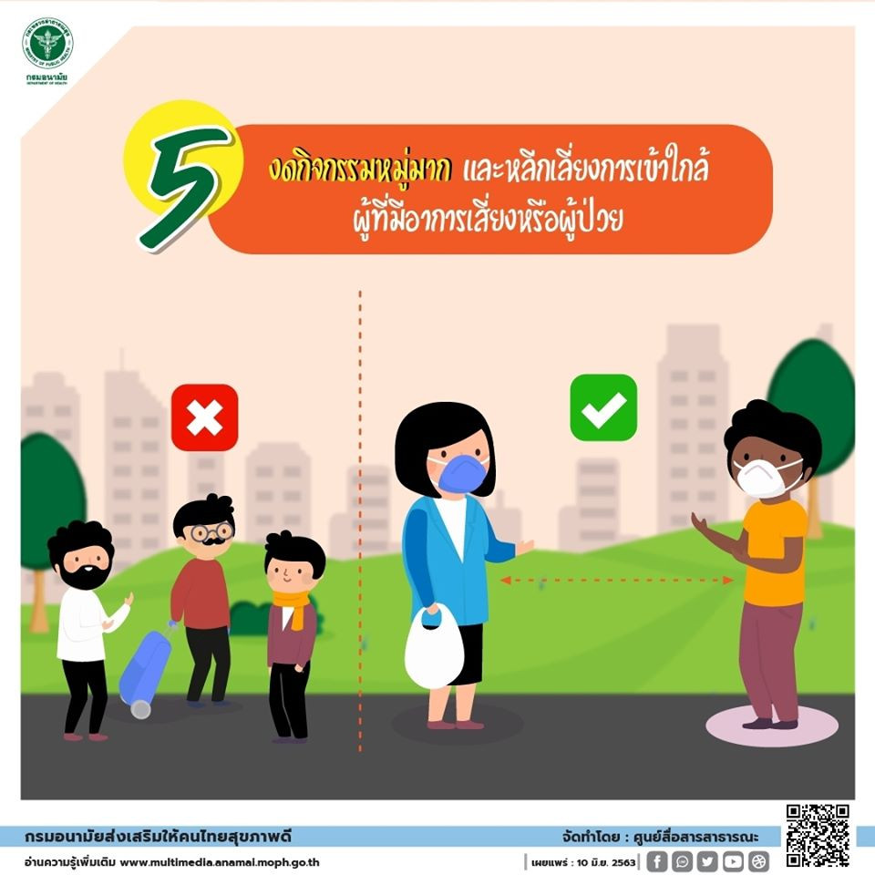 5.งดกิจกรรมหมู่มาก และหลีกเลี่ยงการเข้าใกล้ผู้ที่มีอาการเสี่ยงหรือผู้ป่วย